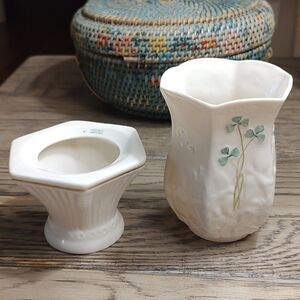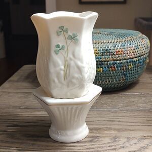 Belleek Doves of Peace 2-Piece Tea Light Holder. Gorgeous Irish pottery with clovers, doves and floral relief design on a cream background. The bottom has a paneled ribbed design and is trimmed in gold. Hand crafted in Ireland.