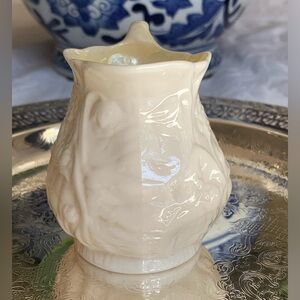 Belleek Ireland vintage sugar and creamer set. Ivory porcelain floral pattern with Belleek signature yellow luster finish inside. Marks on the bottom are the 5th mark stamp, second green, which was produced from 1955-65.