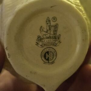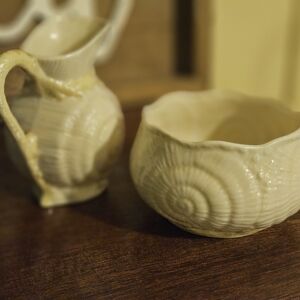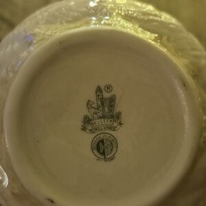 It features an embossed, swirled seashell design. The items are ivory-colored with a shiny pale yellow glaze on the inside and handle and appear translucent when held up to the light due to the delicate and thin porcelain. This set features Belleeck's "fifth green mark," dating it between 1955 and 1965.