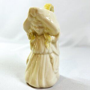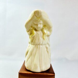 Lovely delicate Belleek small pitcher in the form of a kneeling water fairy, Undine, with her arms raised holding a Claddagh heart above her head. The handle is in the form of a braid of her hair. Made of pearlized porcelain with yellow glaze highlighting her hair. This fine porcelain is known for its thinness, slight translucency, and smooth surface, which are hallmarks of Belleek Pottery’s craftsmanship. The material gives the Undine pitcher its delicate and elegant appearance. The maker’s mark is the 6th Green dating 1965-1980. Made in Ireland.