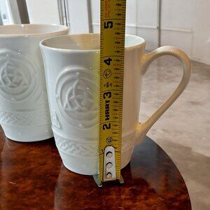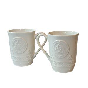 This is a pair of Belleek porcelain mugs in the Celtic Knot pattern. They are in excellent condition with no chips, cracks or crazing. It looks like they have never been used. They are 4-1/8" high, 3-1/4" in diameter across the opening. They hold 10 oz. The bottoms are marked Belleek Made in Ireland