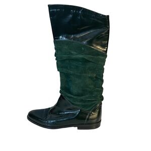Unique and rare. Beautiful color and quality made boots. Made in Italy. Green leather and dark green suede in a scrunch style pull on boot. Approx heel height height 1 inch, shaft height to bottom of heel 16 and opening circumference 7 inches. Lovely condition with some light scuffs to suede and creasing at toe area.