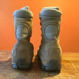 This is a pair of Belleville 693 Waterproof Assault Flight Boot in color sage. Men’s size 5.5 R. 8” shaft. Speed laces. Leather and fabric upper, fabric lining. Padded insole padded rubber soul. Certified safe to fly. Specifications sheet in pictures. Excellent preowned condition. Made in USA.