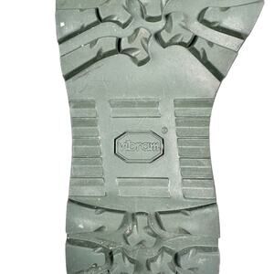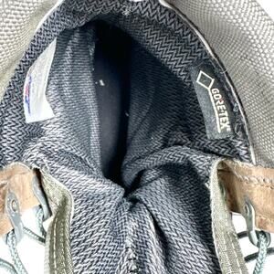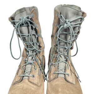 Pre-owned men’s Belleville AFTW sage tan leather suede combat boots featuring composite toe, waterproof and breathable Gore-Tex lining, Vibram sole, and lace up closure.