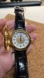 This elegant women's watch features a striking gold case that clicks open and a sleek black genuine leather strap, perfect for any occasion. Bellezza 50 Lira coin watch half-hunter design is a fashion statement. Never used; part of a collection. Original plastic is still on the back case. Will need a battery. Quartz movement.