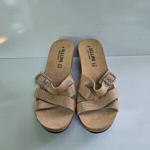 Bellini Made In Italy Rose Gold Leather Slides Size 38. 2.5" Heel, 1" Platform, Adjustable Buckle, Textured Rose Gold, Cork Bottom, Vera Pelle, Made In Italy, Comfort. Like New Condition, Pre-Owned