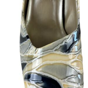 Details: Patent Leather Pumps with a Gray Black Cream Marbled Animal Print Pattern, Block heels and Square Toe.