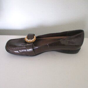 Bellini Womens Faux Chocolate Patent Leather w/Bling Flat Loafer - Size 8M. Previously owned and lightly used, uppers & interiors present "as new", the rubber nubby soles are in excellent condition, while only the rubber heels reveal a light "rub".