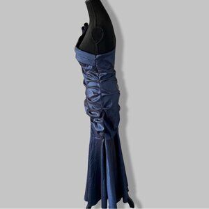 one shouldered prom dress with side zip, pleat detail to front with roll detail at shoulder and fishtail skirt.