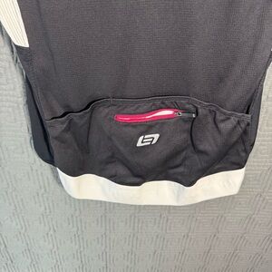 Stylish black cycling jersey with pink and white accents. Features a front zipper and short sleeves. The Bellwether Cycling Jersey is a technical apparel designed specifically for women in size Large. This black jersey features a full zip for easy on and off, making it ideal for casual cycling rides. Made in Taiwan, this cycling top offers comfort and performance for women who enjoy cycling as a recreational activity.