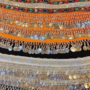 Add flair to your dance with these elegant orange and white beaded hip scarves. Perfect for belly dancing, these accessories feature intricate beadwork and vibrant colors.