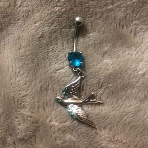 Belly button ring with a light blue stone and a bird with light blue stones on it