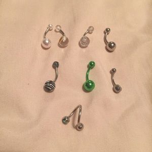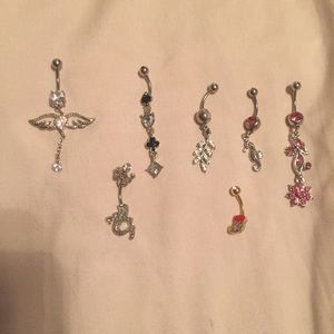 15 belly rings 5 that dangle and 10 regular. They are brand new NEVER worn. I got my belly pierced last year and let it close up I never got the chance to wear any of these. The dangling ones cost me about 10-30 each
