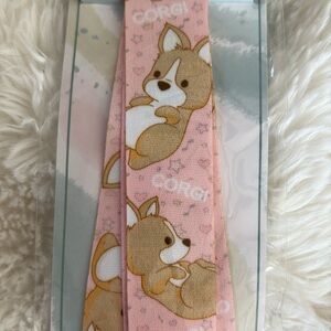 This adorable Bellzi Bundle includes a cute corgi lanyard (pink with tan and white corgis, silver hardware), a Bellzi crown keychain (baby blue with gold hardware), and an enamel sloth pin reading “Hang in There.”