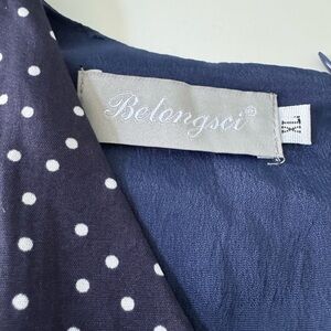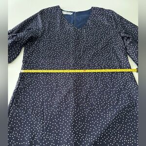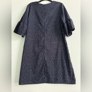 This pretty and easy to wear navy dress with white polka dots will be your go to for any occasion. Features a V-neck design, double ruffle sleeves, hidden zipper and a full lining.