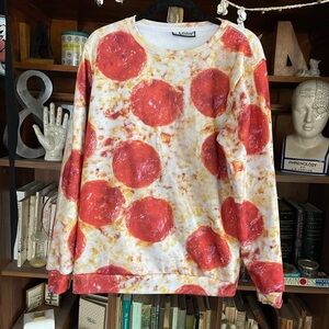 This sweatshirt is so fun! Realistic pepperoni pizza design. 20 in armpit to armpit. 28 in length.