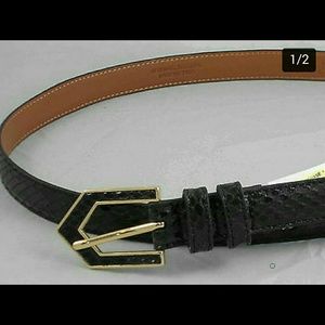Faux python belt with pentagonal polished brass roller buckle with inlaid faux-python trim at the top