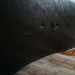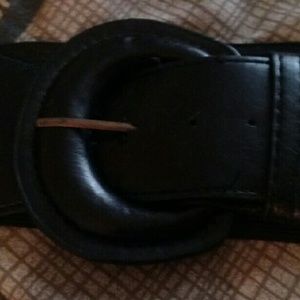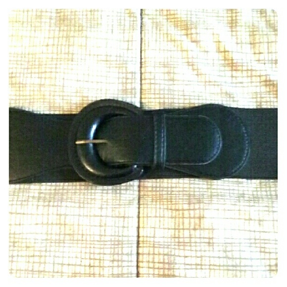 Black stretchy belt. Very slight defect is shown in third pic but isn't noticable when wearing as shown in both picture one and two.