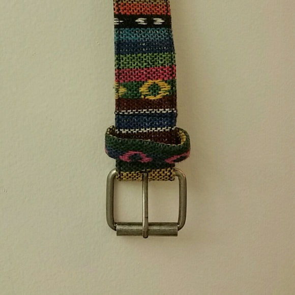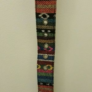 Aztec pattern. Clothe stitching for pattern, leather interior. Some wearing near buckle holes (see photo). Fits large and medium.