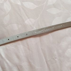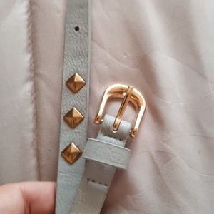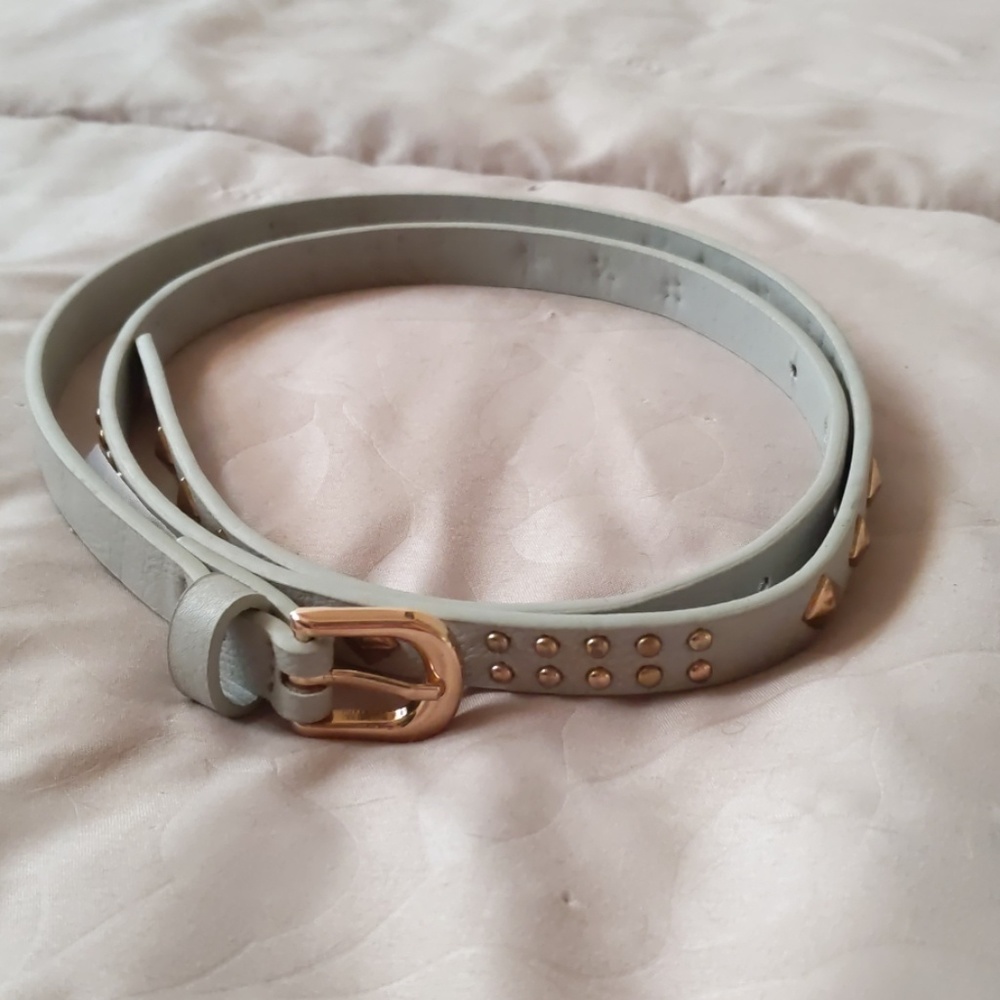 Grey belt trimmed with gold studs. 7 holes for adjusting to your side. The size as seen in pic is M/L