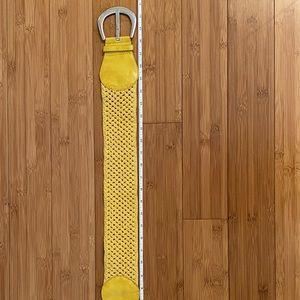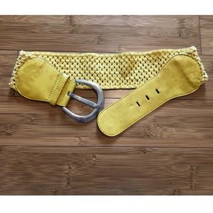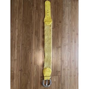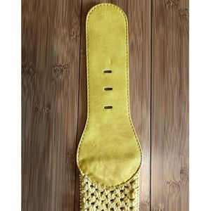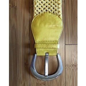 Elegant yellow/mustard/gold colored belt. It is in perfect condition and has NEVER been worn. The middle sector has a beautiful braided detail. There is no scratches or damages to the metal. It is adjustable. It is made up of 80% elastic, 15% P.U., and 5% metal. The perfect accessory to spice up any outfit! Stretchable