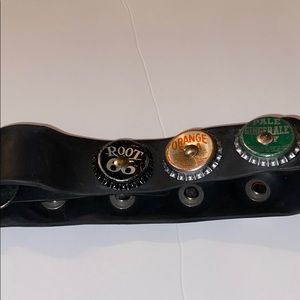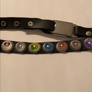 Vintage Seat belt buckle with bottle caps. The entire belt is recycled from tire inter tube and caps recycled along with a vintage seatbelt buckle.