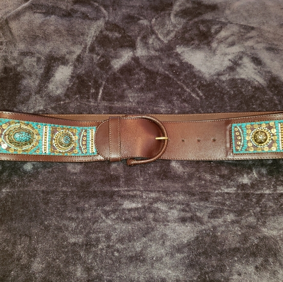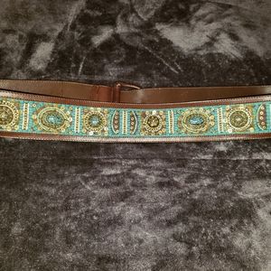 Chico's brand belt. Genuine brown leather with turquoise, gold, white, brown beading. Turquoise stitching. 50.5 inches long from end to end.