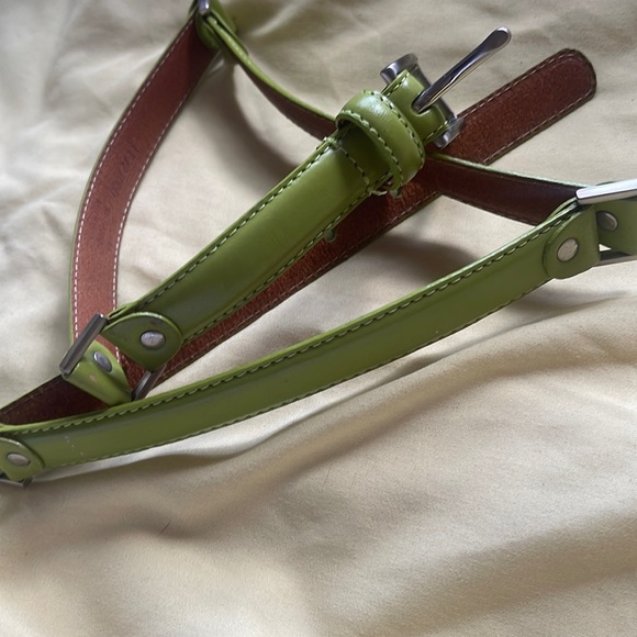 Medium lime green belt with brown interior. Faux leather