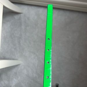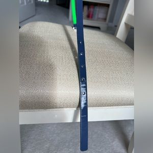 Navy blue belt with silver buckle. Bright green color on reverse side gives it a surprise, subtle pop of color!
