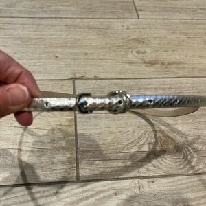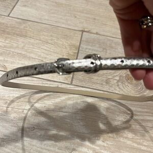 Skinny, silver faux snakeskin belt features silver buckle with double closure. Worn once, this belt is vintage Banana Republic. So fun to dress up or down. Perfect for the holiday season. Measures approximately 40” in length with holes starting at 30”.