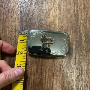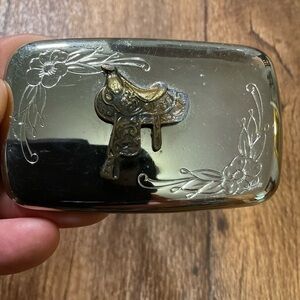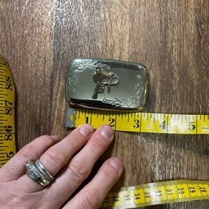 Belt Buckle Saddle Emblem Engraved Floral Corners Rectangle Made In USA, some patina on saddle good vintage condition