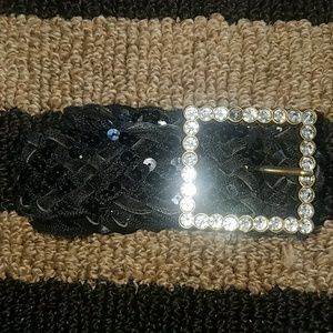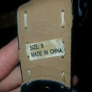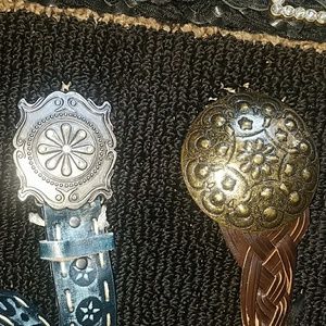 3 Belts in good conditions. Black belt is one size fits all and it streches. Missing one rhinestone shown in the pictures. Brown belt is leather with 2 pulling strands as shown in picture. Says M-L for the size on brown belt. Blue belt says size 9. It shows some wear to it only because it is well loved. The wear is more on the inside of the belt not the outside so it isnt noticeable.