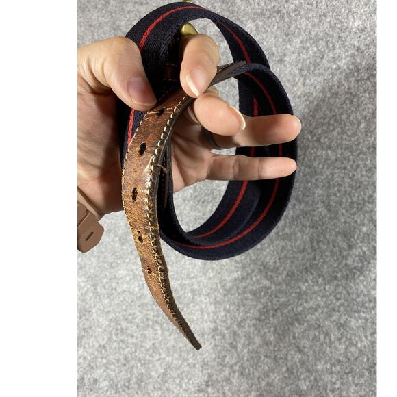 Color: Navy and red web strap; brown leather trim; brass hardware.