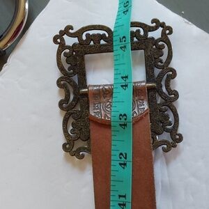 BROWN BELT, SQUARE BUCKLE,CRYSTALS,LEATHER,HAND TOOLED, BOHO,VINTAGE, NEUTRAL, CONTEMPORARY