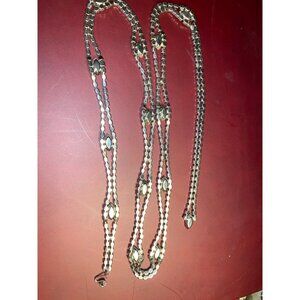 This 1950s Vintage Art Deco Rhinestone necklace is a dazzling double strand of white rhinestones. With a length of 41 inches, it mimics a belt design and brings a touch of vintage elegance to any outfit.