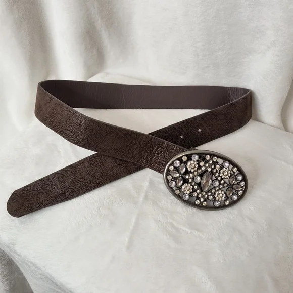 Brown belt with silver buckle and rhinestone details. marked as size 5. #westernvibes #westernbling #bling #belt #country