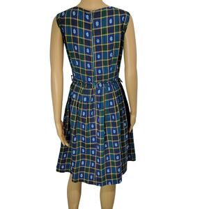 Belted Blue Green Plaid Vintage Handmade Pleated Ribbon Tie Midi Dress Size Small