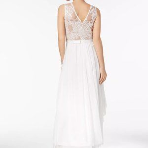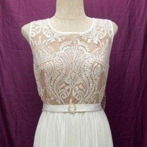 Sparkling sequins decorate the lavish embroidery of a belted gown that flows into a layered and airy skirt, perfect for making an entrance.