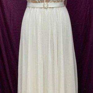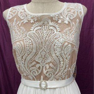 Sequined embroidered mesh bodice; rhinestone-brooch belt with hook closures; layered mesh skirt