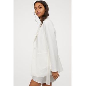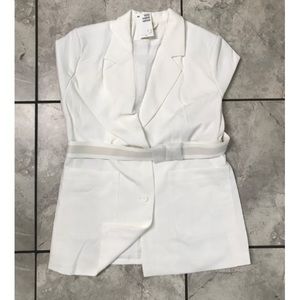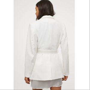 White jacket in woven fabric. Notched lapels, buttons at front, and patch front pockets. Removable D-ring belt at waist and vent at back. Lined.