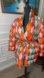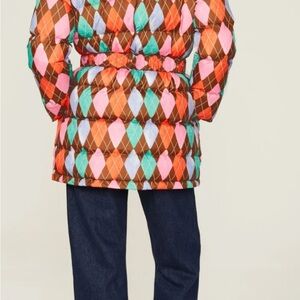 Chic puffer jacket with a vibrant argyle pattern. Features a stylish belt and bold colors. Preloved, in great condition.