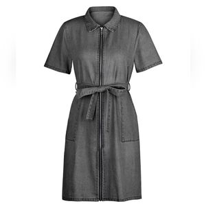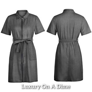 Belted Retro Pocket Denim Dress Collar Short Sleeve Zipper Gray Jean Mini