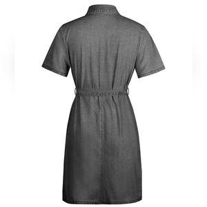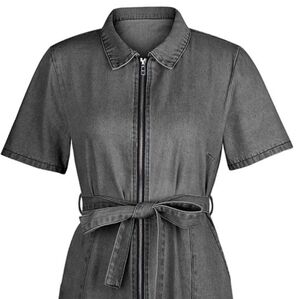 Belted Retro Pocket Denim Dress Collar Short Sleeve Zipper Front Gray Jean Mini