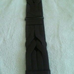Three belts. One orange belt with large silver buckle. Measures 17 inches half fold. Black elastic belt with red rose measures 17 inches half fold. Brown elastic and leather belt with criss-cross straps measures 21 inches half fold. NWT