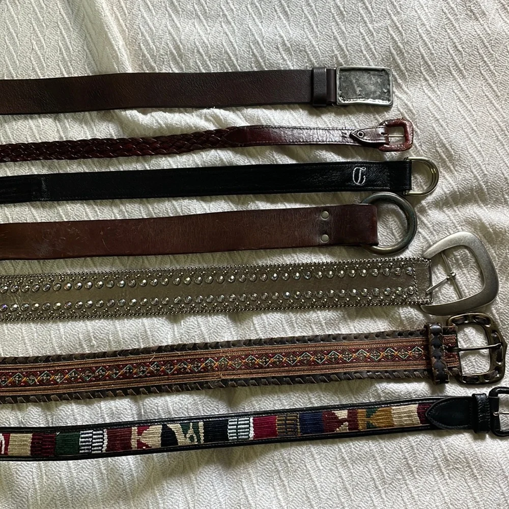 Selling as a bundle for $25 or comment for individual belts $5/each. 5 are genuine leather. The brown leather with ring buckle, brown leather belt with square buckle (Eddie Bauer), brown braided leather (size 36) and the leather/cloth patterned are size M. The black kilim leather belt (red, yellow, green) is size 40.