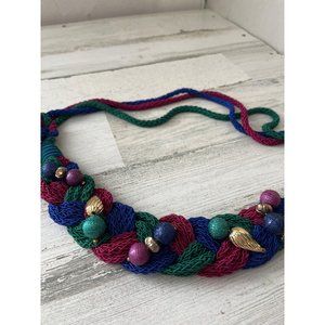 Set of two woman’s fall colored belts. Tan belt has hook closure with metal leaves on braided area. Measures approximately 29” total. Does have a little stretch. Burgundy green blue belt has colored balls on braided area. Has button through loop closure. Measures 42” in length total. Both good pre-owned condition.