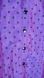 3/4 sleeve button front shirt with fold down pointed collar. Iridescent purple with black polka dots. Fitted at waist. Straight hem at front, rounded and slightly longer at back. Collared v-neck.