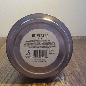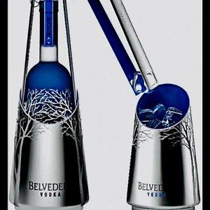 Belvedere Vodka Stainless Steel Ice Bucket Bottle Holder with Tongs/Tong Holder. Silver Tree Design. Blue Interior. Tongs are removable and have snap-on holder inside bucket. Two foam inserts for bottle storage/display. James Bond Spectre Style.Measures 15.5" tall to include handle/tongs attached x 5.5" wide x 5.5" deep. Weighs 13.4oz. EUC.