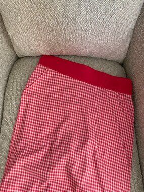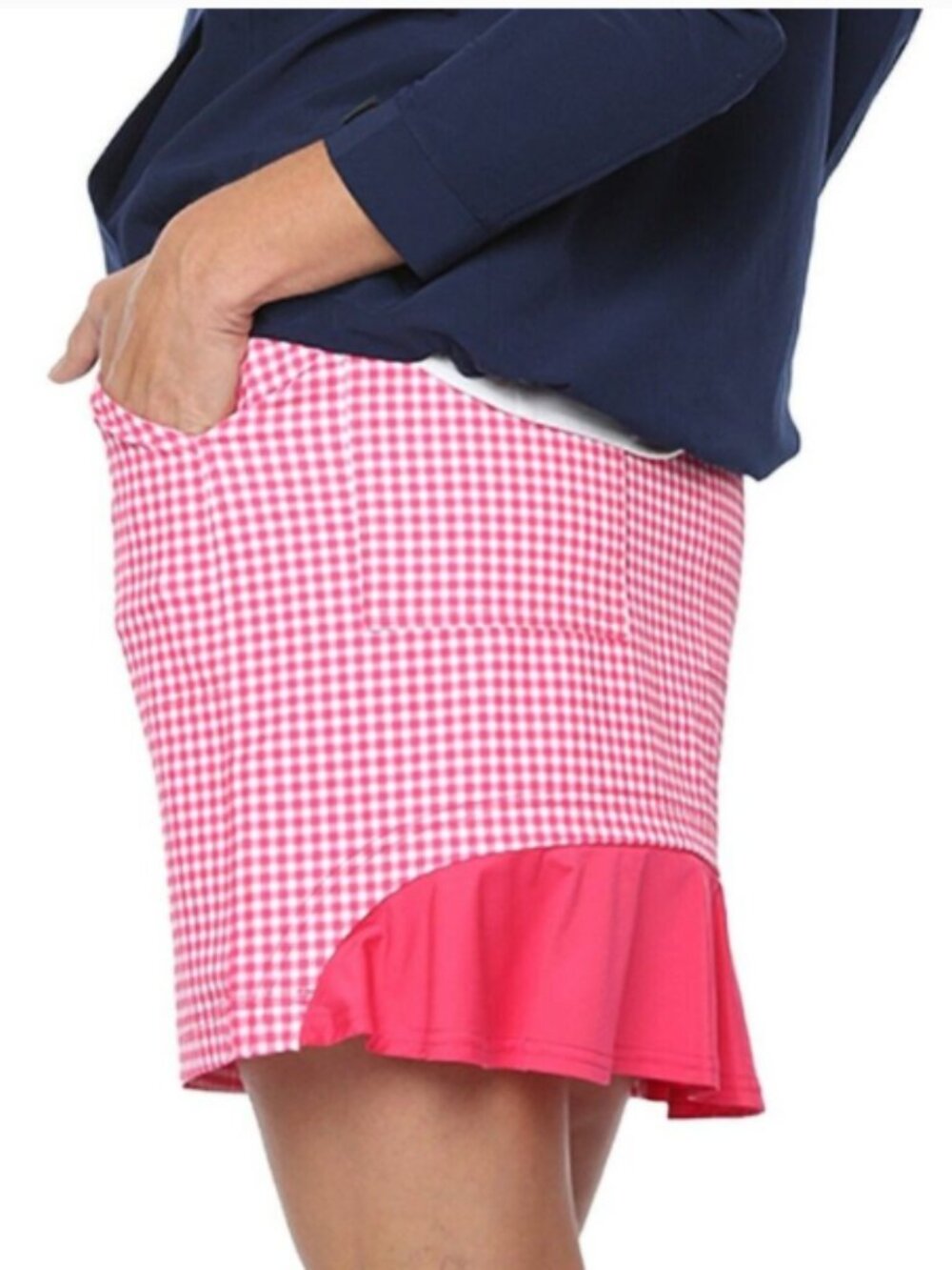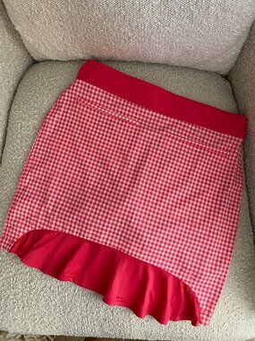 This Belyn Key Melon Check ruffle skort in pink and white is the kind of elevated athletic piece that works everywhere from the golf course to brunch. Crafted from super lightweight, breathable performance fabric, it features an unexpected minimalist ruffle on the back hem that adds feminine charm. Pull-on styling with front and back pockets and built-in undershorts keeps it functional and flattering — perfect paired with polos for the course or styled with sandals and sneakers for casual days. Gently worn and in excellent condition 🤍✨