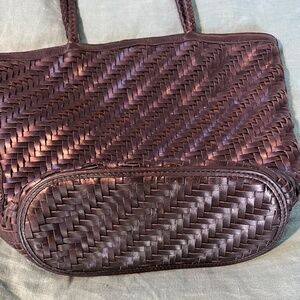 Beautiful black woven leather Bembien tote in excellent condition. Small interior pocket. Lightweight. Very lightly used and minor wear. A few light marks on interior. 12" height. 15" width at top and 9" width at bottom. 4 1/2' depth at base. 11" strap drop.
